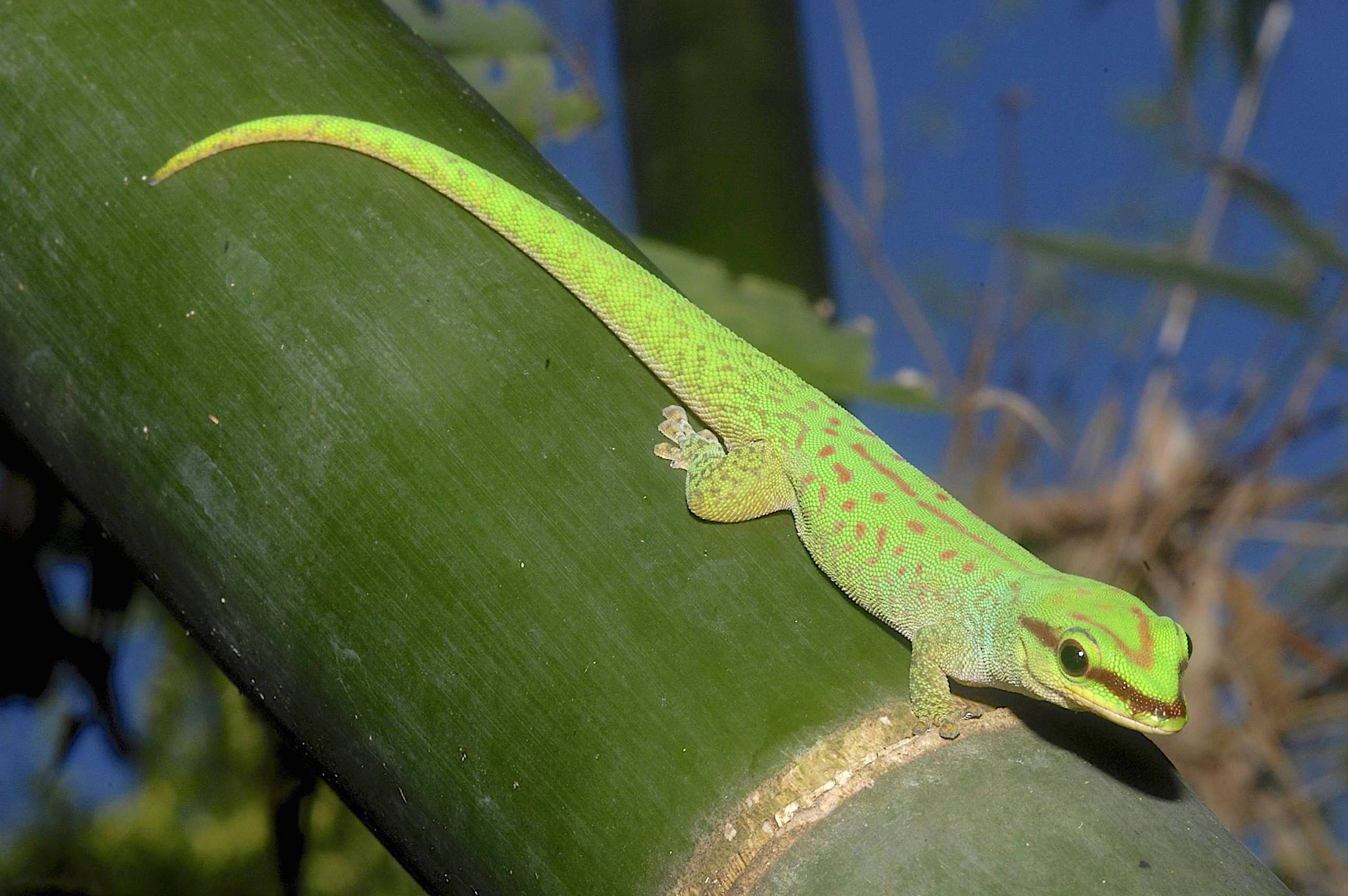 Vyvážený hľadač slnka - Phelsuma seippi vyhrievajúci sa na bambuse na Nosy Komba, Madagaskar. Zdroj (https://exo-terra.com/explore/academy/lighting/)